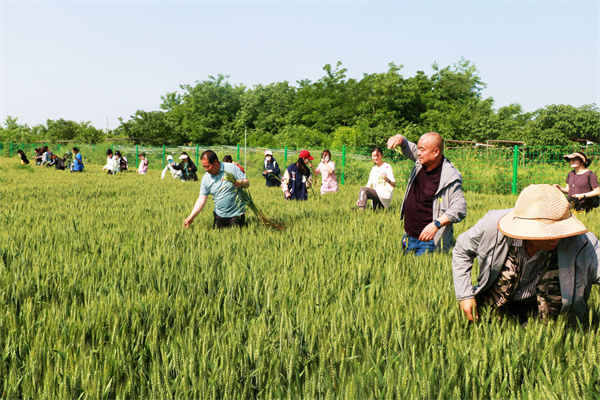 在农事实践环节,饶慧斌在农场自种小麦地头给同学们讲解了田间去杂的意义和作用,引导大家对地里的小麦杂株、大麦、野燕麦、节节麦、雀麦及野苜蓿等杂草进行了形态识别,现场进行了操作示范。随后,同学们在农场职工们的指导下呈“一字型”排开,对田间的杂株杂草进行了拔除清理。初夏午后的烈日炙烤,丝毫不影响同学们认真劳作的热情,大家看着身后齐整均匀的小麦穗层,汗水浸湿发际的辛苦也挡不住收获知识的快乐。