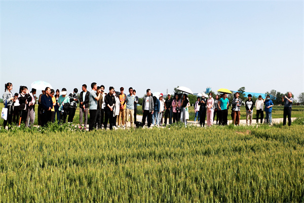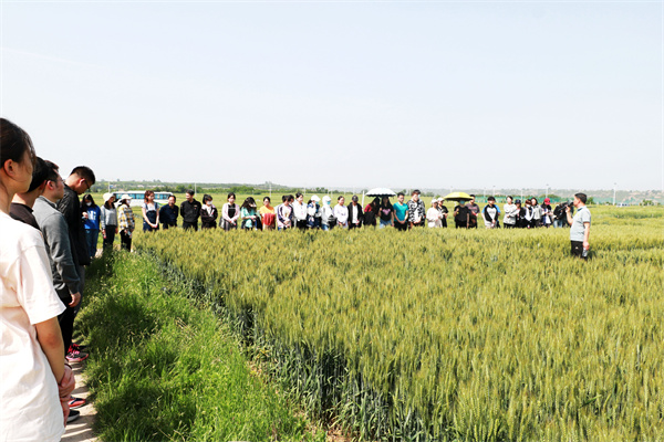 其次,饶慧斌带领同学们依次参观了上合小麦育种创新基地、小麦生物学创新研究平台、小麦品系比较试验和杂交后代选种圃等不同类型试验田,科普讲解了我校吉万全、闵东红等专家教授最新的小麦育种方法、技术及取得的显著成绩。穿插讲述了以张正茂研究员为代表的专家群体开展农业国际合作,在“一带一路”沿线国家播撒“中国种子”、 传播我国先进农业生产技术和管理理念的故事。
