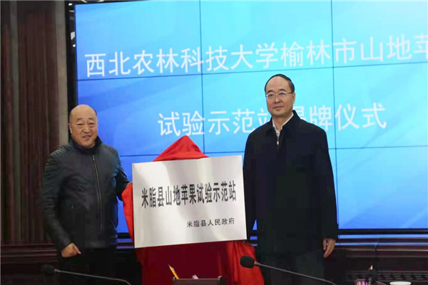 米脂县县长高寒、场站管理处处长朱荣科为西北农林科技大学米脂县山地苹果试验示范站揭牌