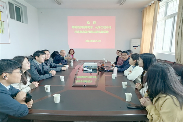 11月4日,葡萄酒学院党委葡萄学、化学工程市场党支部17名师生党员代表在支部书记惠竹梅、袁春龙带领下来到斗口试验站开展主题党日活动。副校长郑英宁参加本次活动。